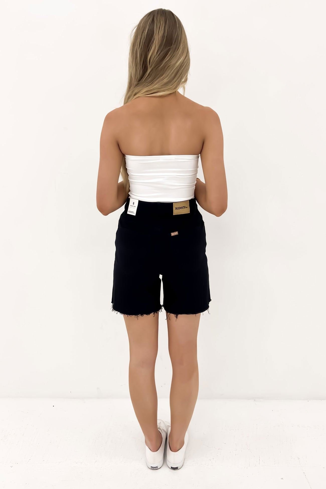 The Straight Short is Riders high waisted, classic straight short that is effortlessly cool. This short fits snug on the waist, slim through the hips, with a relaxed straight leg profile that finishes at mid-thigh length. Made in a vintage washed black with the look of vintage denim and the comfort of hidden stretch, Details-- Straight fit- High rise- Comfort stretch denim- Straight leg- Regular inleg- Zip fly- Tonal black stitching- 50% Cotton 21% Recycled Cotton 25% Polyester 3% Rayon 1% Elastane